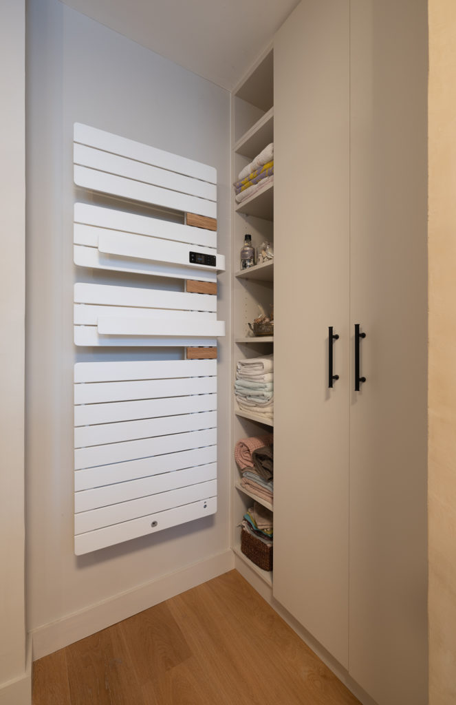 Le sèche-serviette modèle « Virtuose » intègre un dispositif sonore avec haut-parleur permettant d’écouter la musique depuis son smartphone.