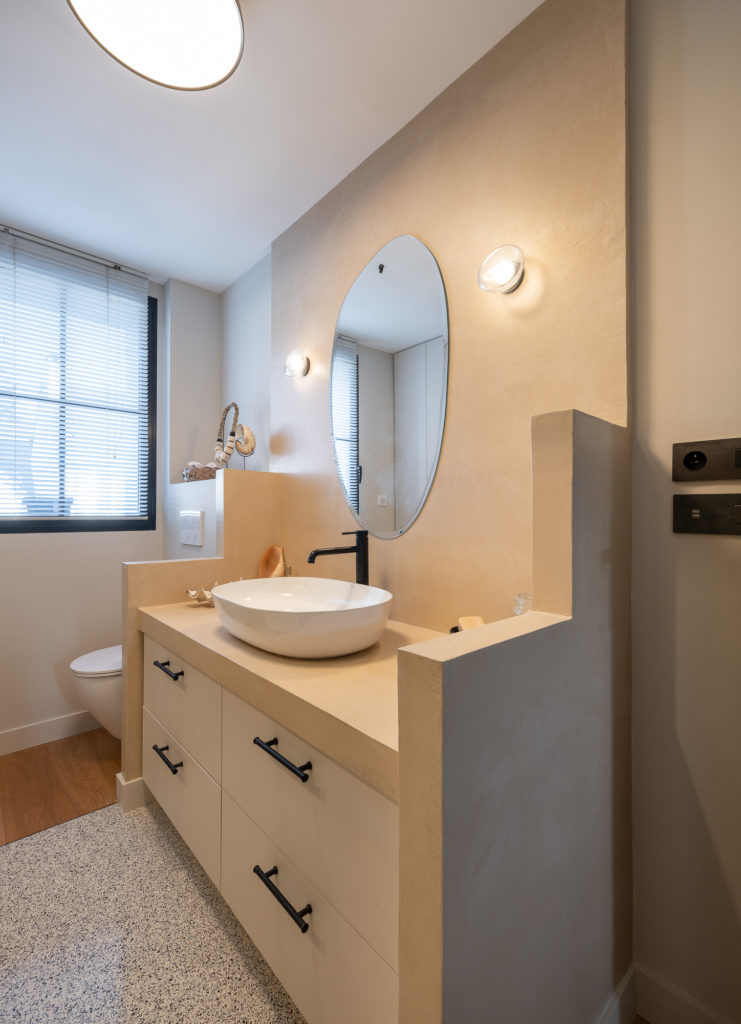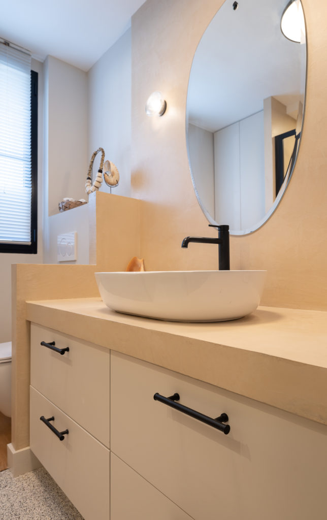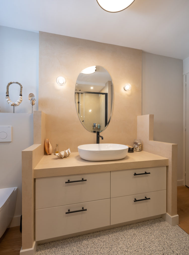 Les parois de la douche, le meuble vasque et le pan de mur soutenant le miroir « goutte d’eau » sont réalisés en béton ciré de ton chaud et lumineux. Les accessoires sont noirs (poignées, patères, douche, robinetterie, …) et les prises de courant et interrupteurs en finition brut acier sont de la gamme M chez Modelec. M comme Valérie Mazerat la créatrice et amie de ce beau produit intemporel.