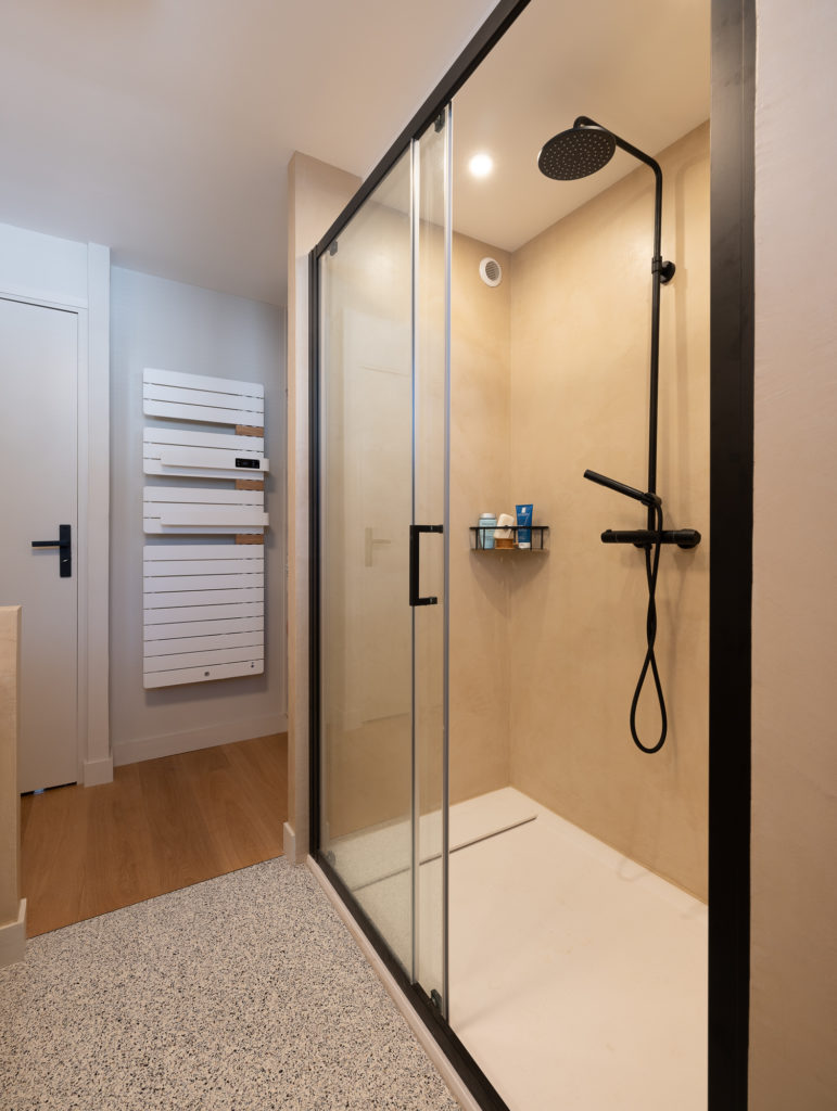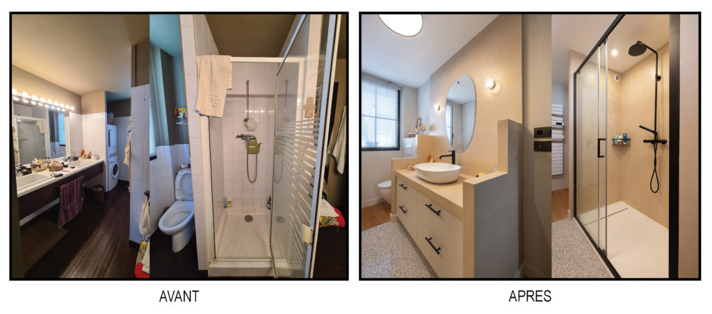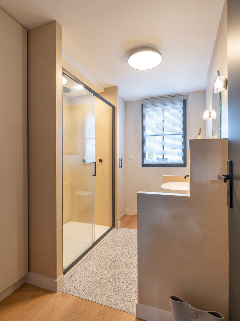 C’est donc une réorganisation complète qui a été proposée afin d’offrir une grande douche confortable et des rangements discrets mais conséquents.